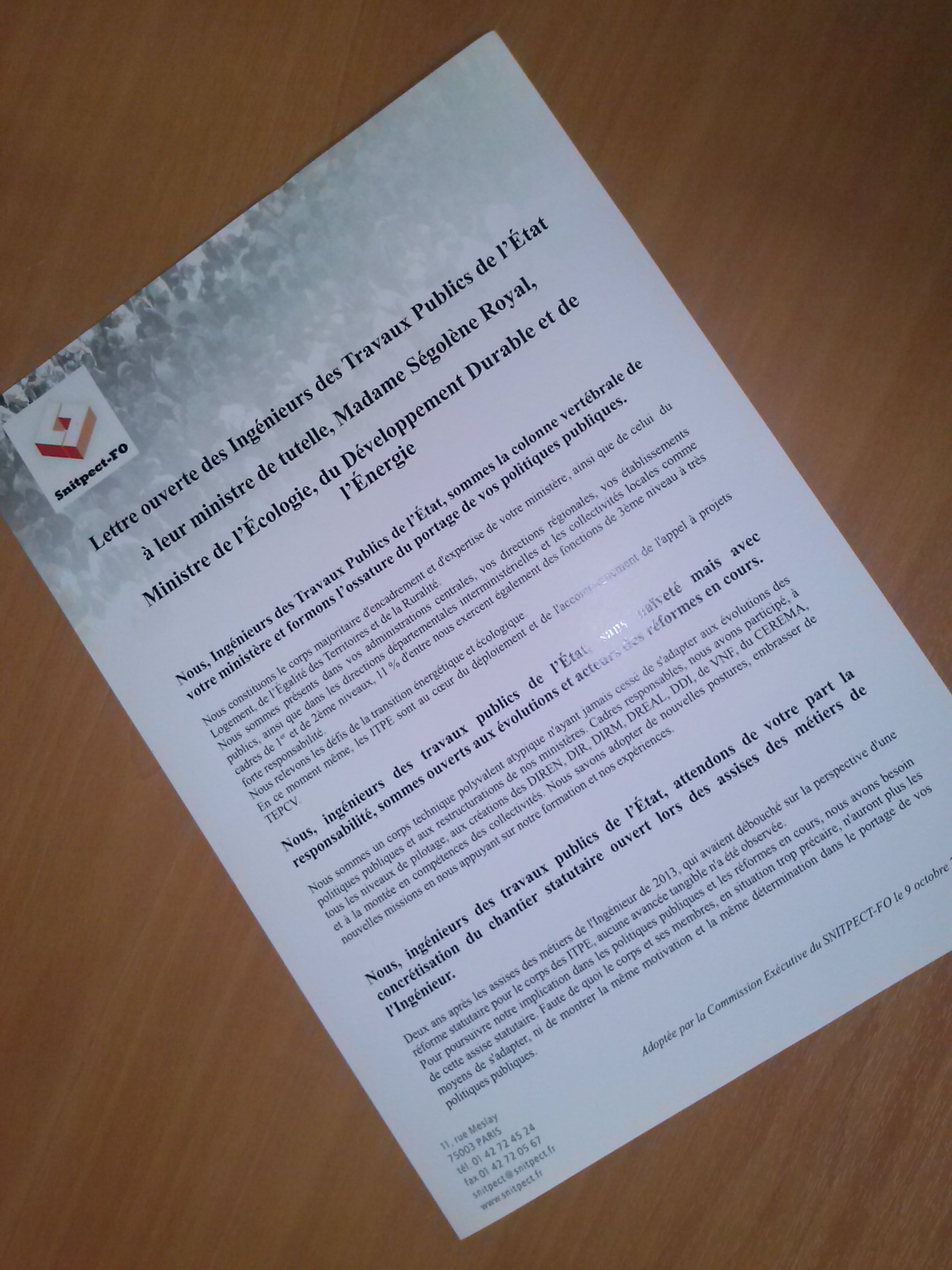 Retrouve la déclaration préalable, la lettre ouverte des ITPE adressée à la ministre du MEDDE/MLETR ainsi que le courrier des ICTPE adressé collectivement au Président de la CAP et remis ce jour.