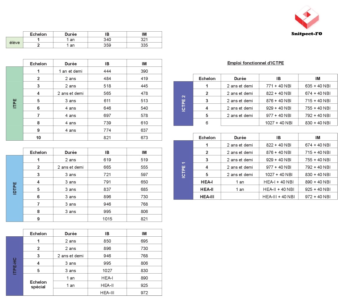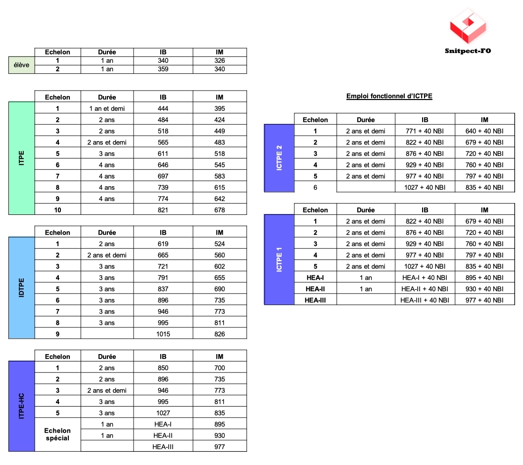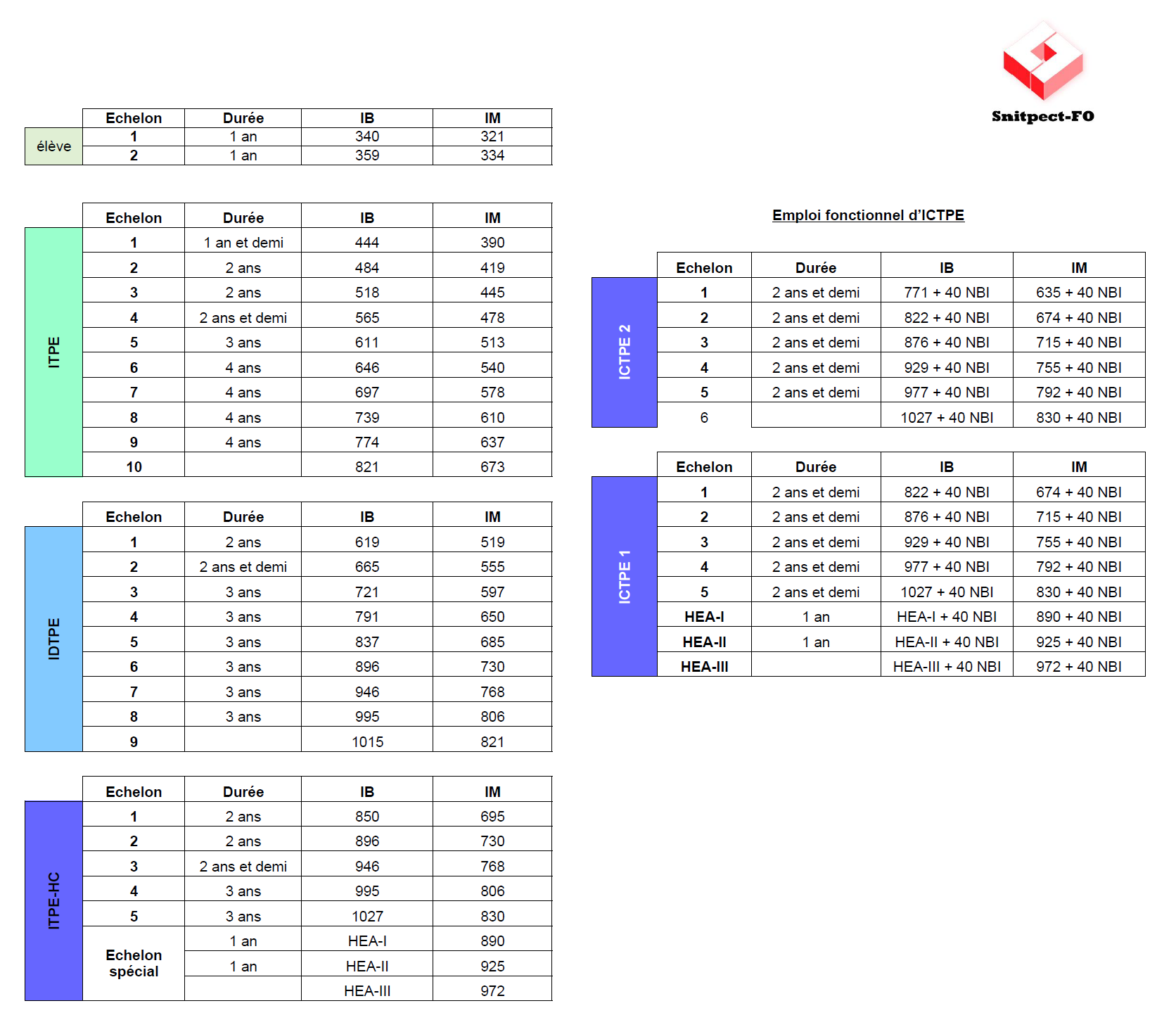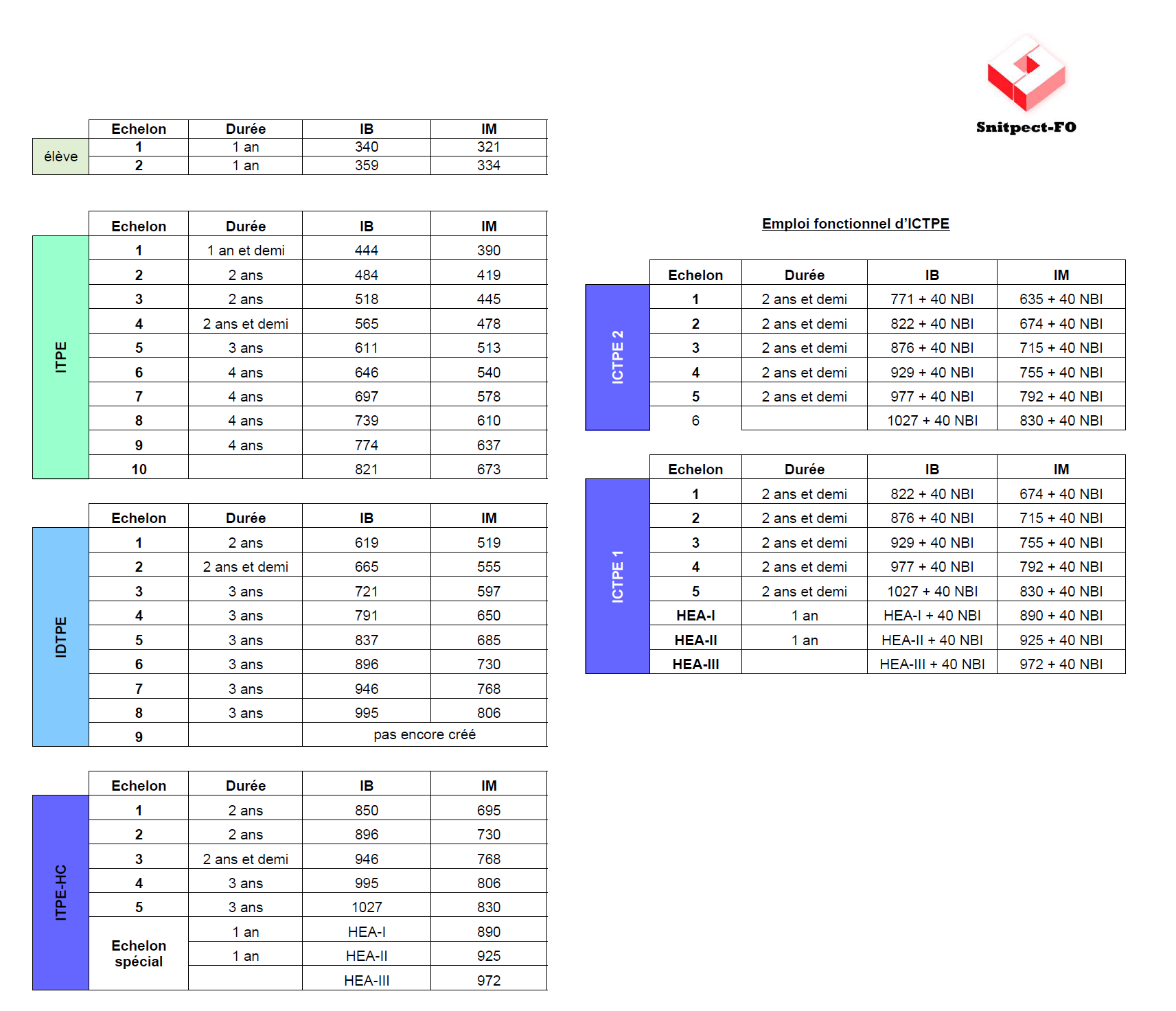 L’échelonnement indiciaire applicable aux ICTPE des 1er et 2ème groupes est fixé par l’article 17 du décret n°2012-1058 du 17 septembre 2012 modifié. La durée des échelons est fixée dans le décret n°2005-632 du 30 mai 2005 modifié.