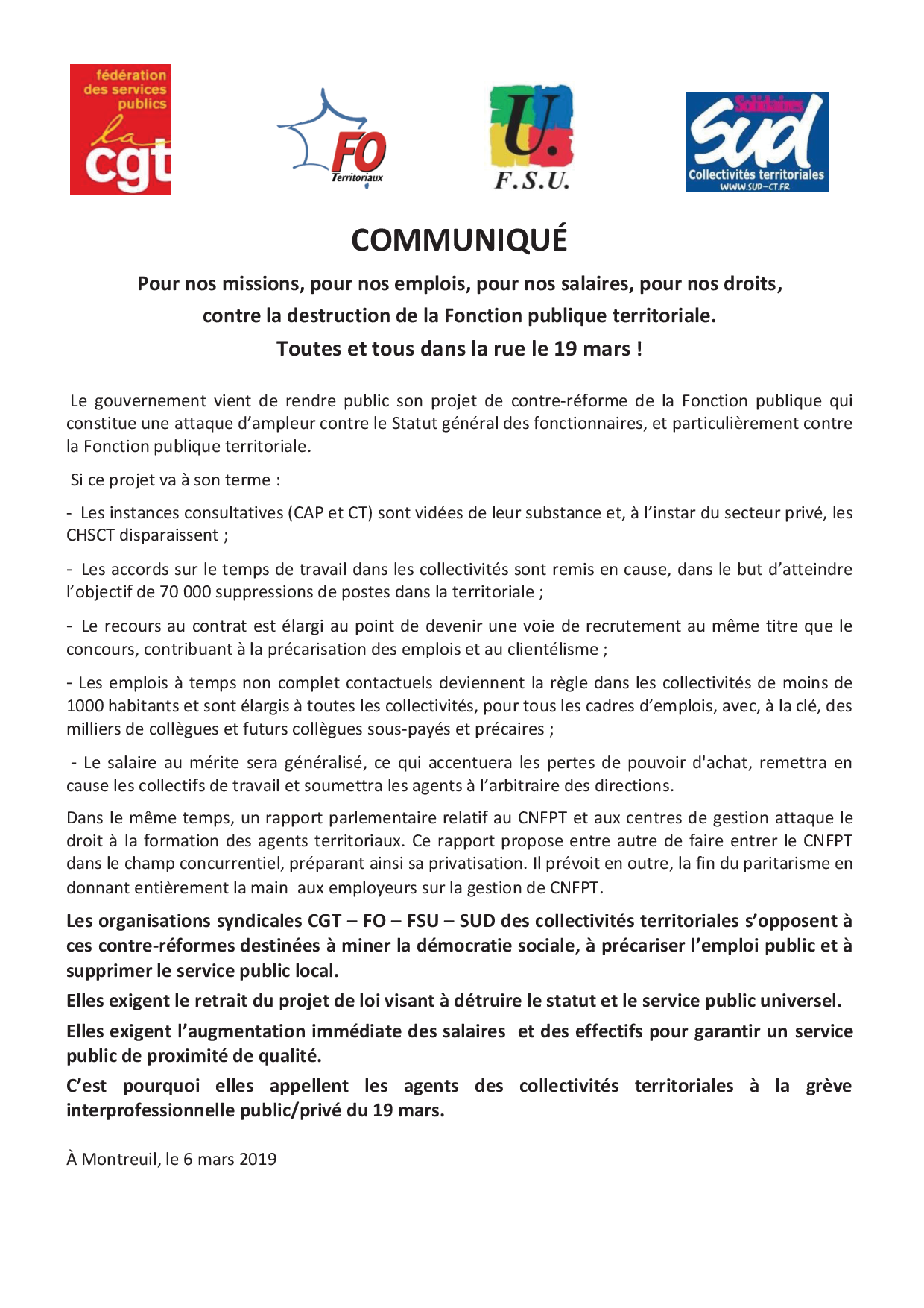 La territoriale également attaquée par le projet de transformation de la Fonction Publique 12/03/2019