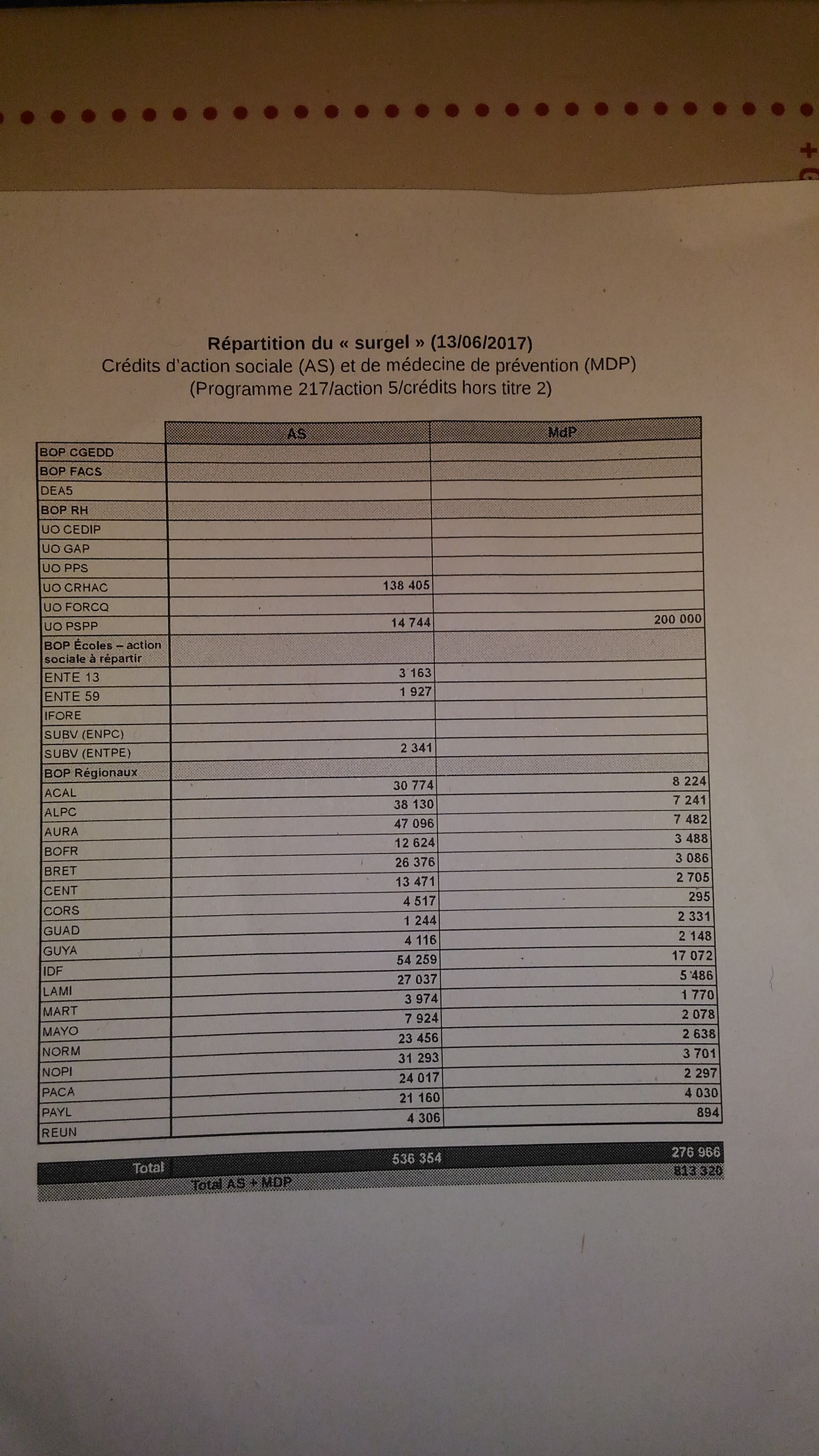Face à l’absence patente de réponses du DRH, FO a décidé de quitter la séance, montrant le chemin en étant suivie par l’ensemble des autres OS. Ce qui amena le DRH à sortir de sa posture déloyale, et à mettre sur la table la vérité de chiffres confirmant les estimations de FORCE OUVRIERE (voir la répartition du gel action sociale). Ce sont ainsi plus de 800 000 euros qui sont en cours de reprise sur les seuls budgets action sociale/médecine de prévention, par application d’un « surgel estival » sur les crédits ministériels ! Et autant dire que bien d’autres postes sont programmés pour une mise à la diète (formation, partenariat associatif, prévention des risques professionnels…).