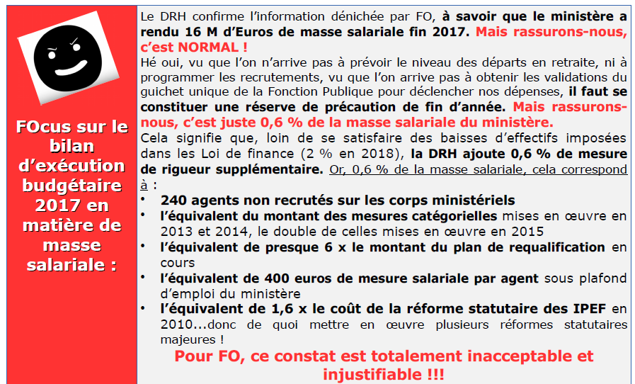 - de faire reconnaître au DRH qu’il a rendu 16 millions d’€ de masse salariale en fin d’année … en nous assurant que cela est tout à fait normal. Non, pour FO, il n’est pas normal de rendre 16 M d’euros de masse salariale en fin d’année !!!