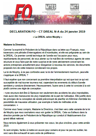 Déclaration préalable CT DREAL Nouvelle Aquitaine – « La DREAL selon Murphy » 25/01/2019 Après la fusion des régions, la DREAL Nouvelle Aquitaine vit actuellement une énième réorganisation, non concertée. Retrouve la réaction de FO lors du premier CT de l’année.