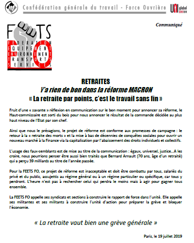 Réforme des retraites : communiqué de la FEETS-FO « Y a rien de bon dans la réforme à Macron » 19/07/2019
