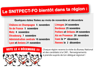 Consultations juridiques : nouvelles datesCONSULTATIONS JURIDIQUES EN DROIT ADMINISTRATIF offertes par la FGF-FO dans le cadre de ton adhésion : retrouve les dates. Lire la suite. Congrès 2014 : le menu des assemblées générales de sectionRetrouve le projet de grille de cotisations 2015. Lire la suite. FO interpelle le SG lors de sa visite à Lyon le 21 novembre 2014Les représentants FO de la DREAL Rhône Alpes ont, au cours de l’audience donnée aux organisations syndicales, alerté le nouvel SG des MEDDE/MLETR, Francis Rol-Tanguy: avenir des DREAL, cinq ans à peine après leur création, mobilité, régimes indemnitaires, risques psychosociaux, découvre les réponses du SG dans le compte-rendu FO ! Lire la suite. Nouvelle formule graphique, nouveau mode d’accès: depuis le 16 mai 2014, le nouveau site du SNITPECT-FO est lancé ! Accès à son profil/accès adhérent. Pour recevoir chaque jour les nouveaux articles du site, suis l’actualité par flux RSS (Comment s’abonner au flux RSS ?) ou sur notre compte TWITTER. Adhésion au SNITPECT-FO