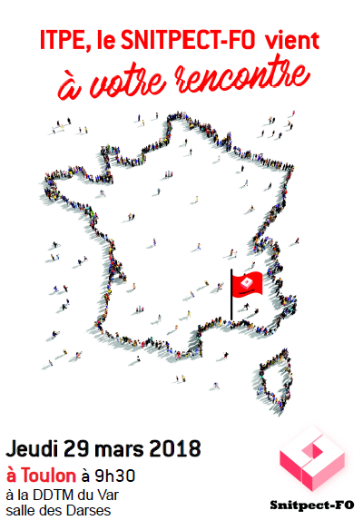 Assemblées Générales extraordinaires organisées en présence du Secrétaire général du SNITPECT-FO : Le 29 mars à Toulon : 9h30 à la DDTM83 Le 30 mars à Marseille : 9h30 à la DDTM 13 Le 30 mars à Aix-en-Provence : 14h au CEREMA DterMed Lire la suite.